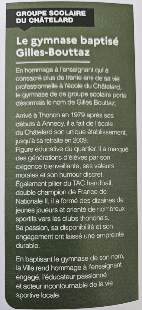 Voici un petit article sur le mag info de Thonon de ce mois qui devrait tous nous ravir. Bel hommage à notre copain qui a tant fait pour l’Ecole et le handball. (Gilbert)